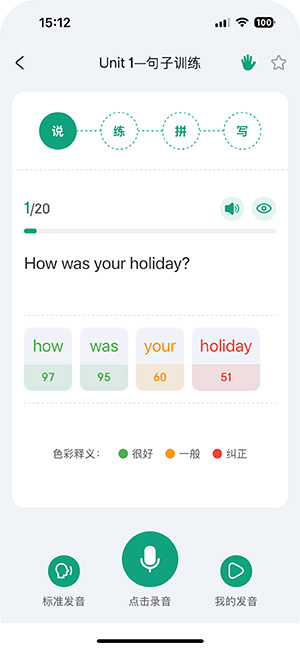 • 专业语音评测,跟读即时反馈,突破口语与听力。